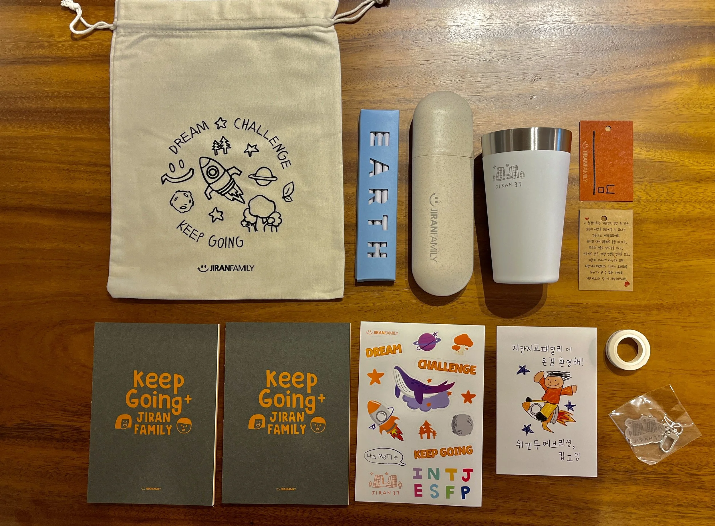 Contains a notebook, sticker, post card, eco-friendly pencil, oral cleansing kit, water bottle, masking tape, pouch, and a key ring